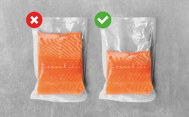 Często do woreczka wkłada się zbyt dużo produktów. Aby zapewnić idealne zgrzewanie, woreczek nie powinien być wypełniony więcej niż do dwóch trzecich objętości. Rozłóż żywność możliwie równomiernie i umieść woreczek w komorze próżniowej lub na zgrzewarce tak, aby nie było zagięć ani fałd. Dzięki temu powietrze zostanie skutecznie odessane, a woreczek szczelnie zamknięty.