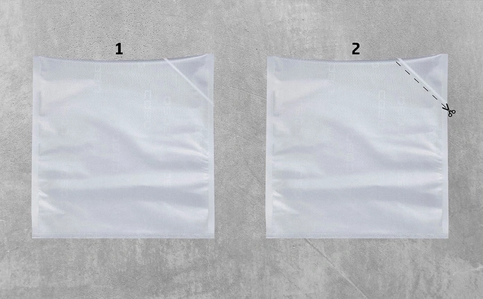 Zgrzej jeden bok folii pod lekkim kątem, następnie odetnij nadmiar folii wzdłuż ukośnego zgrzewu i zapakuj próżniowo woreczek w zwykły sposób.