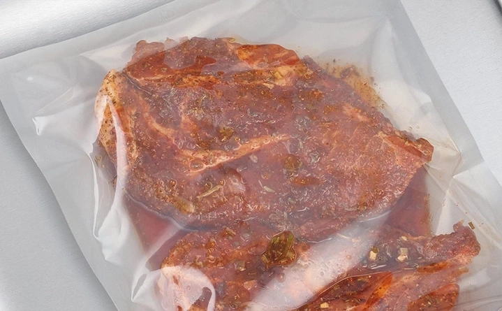 Osusz mięso, rybę lub warzywa. Wywiń otwartą stronę woreczka próżniowego na zewnątrz, tak aby górna część pozostała sucha do zgrzewania. Następnie włóż produkty do woreczka (jeśli jest ich kilka, postaraj się, aby się nie stykały) i dodaj marynatę. Następnie wyprostuj wywiniętą część woreczka i złóż go tuż nad zawartością, aby górna strefa pozostała sucha i nic nie wyciekało. Rozprowadź marynatę, starając się unikać pęcherzyków powietrza. Odsysaj powietrze z niską siłą, zgrzej woreczek i pozostaw do marynowania na co najmniej 30 minut – gotowe.