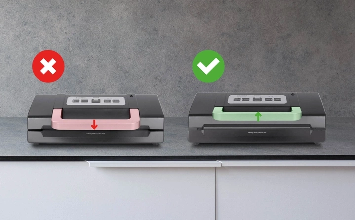 Umieść woreczek w zgrzewarce jak zwykle. Jeśli trudno go włożyć, najpierw przyciśnij pokrywę po jednej stronie (z woreczkiem w środku), potem delikatnie naciągnij folię na drugą stronę i dociśnij pokrywę również tam.
